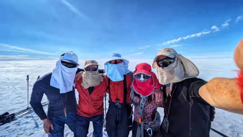 Today we walked five shifts and skied two, covering a total of 26 kilometers. We left at a quarter past four, and our workday ended at 5:30 PM. We have now covered 181 kilometers. Despite the cold in the morning, we burn alive in the sun during the day. The thermometer showed 26 degrees in the sun and 30 degrees in the tent. In the shade, it was 13 degrees above zero. Everything must be covered or smeared with at least factor 50 sunscreen. Unfortunately, I forgot to apply it to my right earlobe, which got burned. Tomorrow, another warm day awaits us before we have a rest day. After that, we’ll see how it goes. Until the next update!