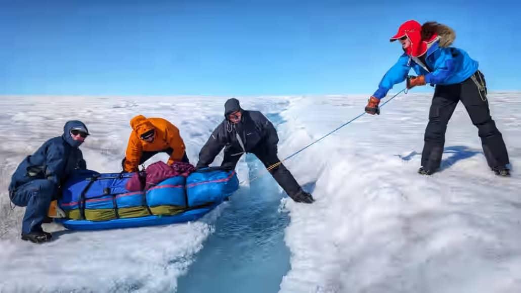 Omslag naar echte ijsberen in de Arctische omgeving, met teamleden die een persoon uit het ijs trekken.