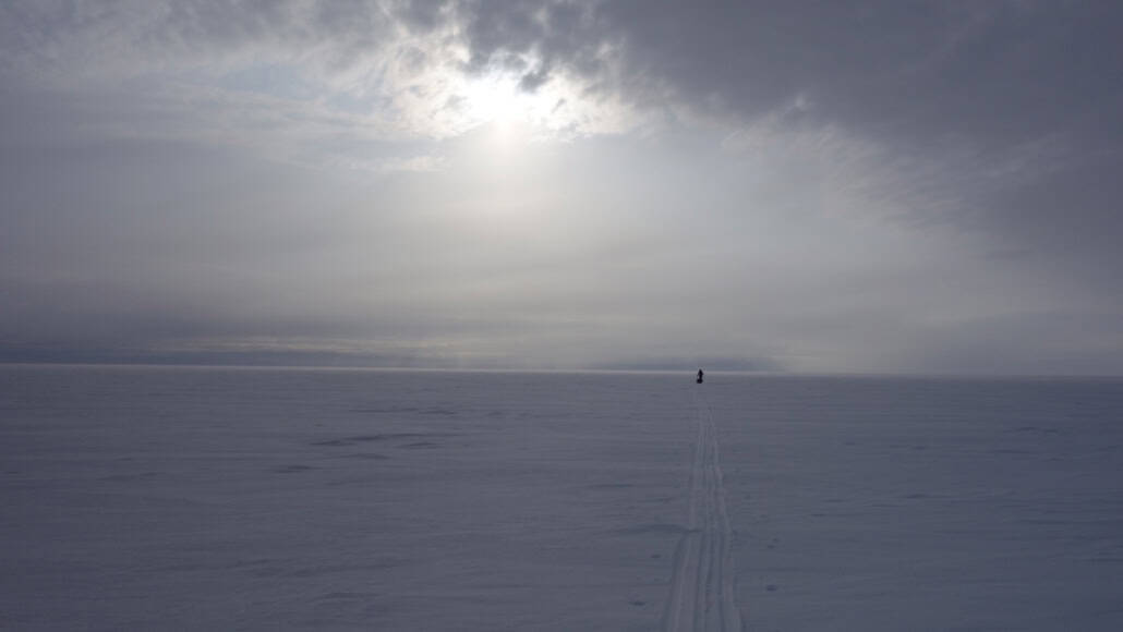 Rustige sneeuwvlakte met enkelspoor en een persoon in de verte tijdens bewolkt weer in de Arctic.