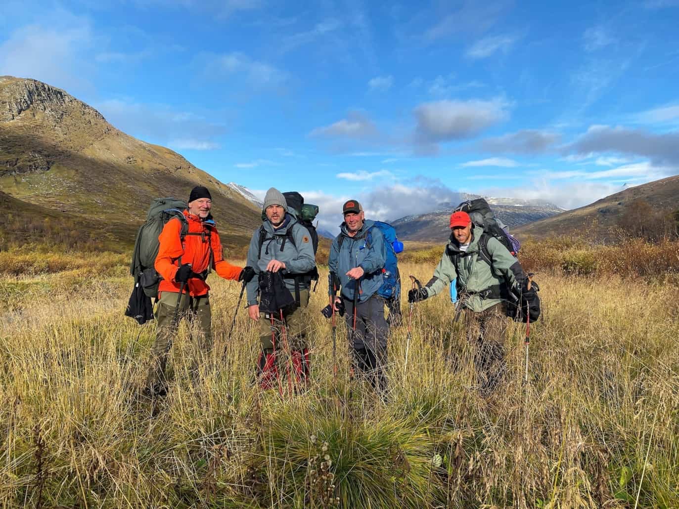De dagen daarna genoot ik van de schitterende landschappen waar we doorheen liepen, met nog meer meren, rivieren en watervallen, maar ook met besneeuwde bergtoppen en gletsjers. Verder zagen we elanden en rendieren in de verte. Het ene moment scheen de zon, dan viel er weer natte sneeuw. Ook hadden we al snel een serieuze rivieroversteek. Dat betekende wandelschoenen en sokken uit, waterschoenen aan, lange (onder)broek opstropen tot aan je knieën en voorzichtig manoeuvrerend naar de overkant lopen. Bij de eerste stappen door het ijskoude water wist ik niet hoe ik het had, laat staan hoe ik überhaupt de overkant zou halen. Maar hoe verder ik liep, hoe meer er een soort van gewenning optrad en de kou steeds minder werd. Aan de overkant was het dan vervolgens snel afdrogen, sokken en schoenen weer aandoen en doorlopen. Wat een ervaring!